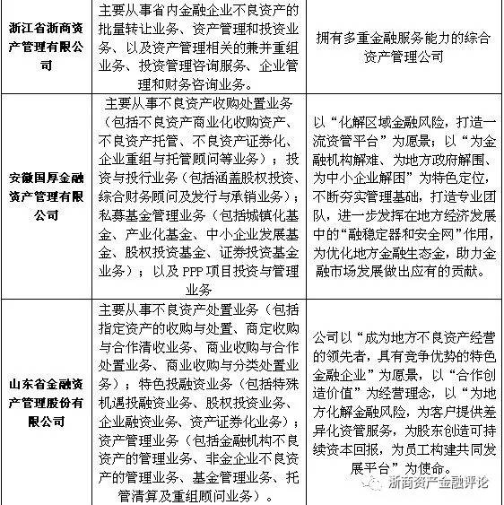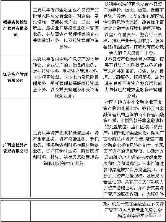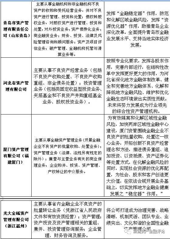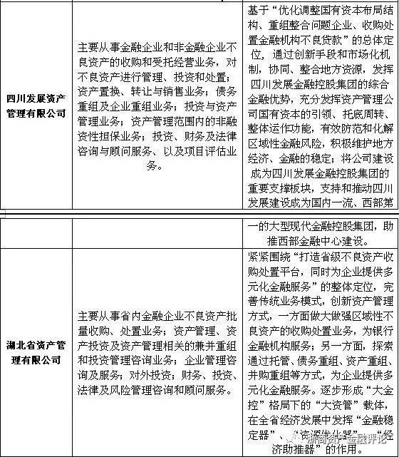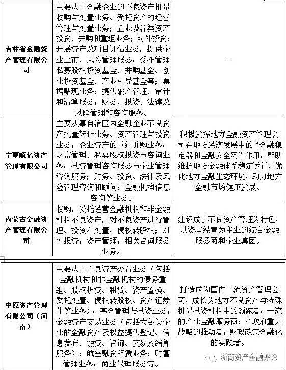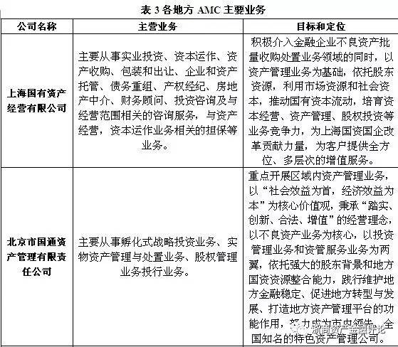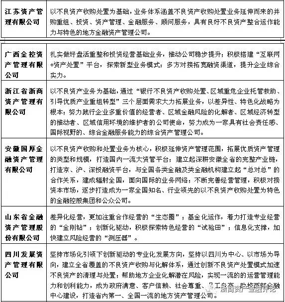 資產(chǎn)管理公司對不良資產(chǎn)的處置需要運用到多種手段,因此,開展相關(guān)業(yè)務(wù)輔佐不良資產(chǎn)的處置就顯得尤為重要。但由于各地方AMC的定位不同,其所開展的主要業(yè)務(wù)也有所差異,例如有些地方AMC將自身定位為地方不良資產(chǎn)的“收集器”,因此主要以收購不良資產(chǎn)業(yè)務(wù)為主;而有些地方AMC則側(cè)重于解決地方政府和國有企業(yè)的不良資產(chǎn)問題,在開展不良資產(chǎn)業(yè)務(wù)的同時還開展結(jié)構(gòu)化業(yè)務(wù);還有部分地方AMC以市場化的資金業(yè)務(wù)為主,將自身打造為地方綜合金融服務(wù)平臺。具體如下表所示: