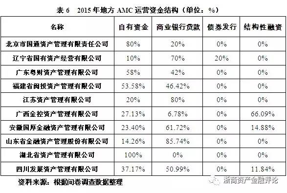 資本金來源。地方AMC的股權(quán)資金來源較為多樣,除了地方政府,還允許社會資本入股,例如海南海德實業(yè)股份有限公司取得西藏政府的授權(quán),成為西藏地區(qū)的持牌AMC。當(dāng)然,從注冊資本和股東構(gòu)成上來看,大部分資本仍然由地方政府投入,其余的部分由社會資本或其他機構(gòu)投入。例如上海地方AMC注冊資本最高,達到了55億元,同時,江蘇、上海和廣西地區(qū)的地方AMC注冊資本也普遍較高,達到了50億元。其中,江蘇、浙江、北京等地方AMC的注冊資本完全由國有資產(chǎn)構(gòu)成,由國資企業(yè)全資持有;而河南、湖北、江西等地方AMC的注冊資本則由國有資本和民營資本兩部分構(gòu)成。值得注意的是,安徽國厚金融資產(chǎn)管理有限公司、中原資產(chǎn)管理有限公司、內(nèi)蒙古金融資產(chǎn)管理有限公司和山西華融晉商資產(chǎn)管理公司的主要股東中分別包括中國東方(子公司控股)、中國信達和中國華融。不難發(fā)現(xiàn),四大AMC也在積極的通過控股和參股地方AMC的方式,布局區(qū)域不良資產(chǎn)市場。由于絕大多數(shù)地方AMC現(xiàn)階段難以通過上市融資的方式獲得資金,因此通過股東注入資本、發(fā)行債券和股權(quán)融資等方式籌集資金就顯得尤為重要,而對于多數(shù)地方AMC來說,股東注入的資本是資金來源的大頭,所以從股東結(jié)構(gòu)上來看,許多地方AMC都采取的是多元控股的結(jié)構(gòu)--與單一控股的地方AMC相比,多元化的股東結(jié)構(gòu)不僅能幫助搭建自身的金融平臺,更快捷的募集資金,減少搜尋成本。同時,復(fù)合的股東背景能在具體業(yè)務(wù)的開展、債券股權(quán)融資和未來的轉(zhuǎn)型方面,提供一定的信息優(yōu)勢、隱性擔(dān)保和更多的選擇,進而提高地方AMC的資金使用效率和籌集能力。而除去股東注入的資金,商業(yè)銀行對地方AMC發(fā)放的貸款也是地方AMC日常運營資金中的重要組成部分(如表7所示)。其中江蘇和山東資產(chǎn)管理公司的日常運營中的資金中,商業(yè)銀行貸款所占比重達到了80%以上,遼寧和安徽資產(chǎn)管理公司的商業(yè)銀行貸款占比也都高于自有資金(股東注入資金),可以看出商業(yè)銀行貸款也是地方AMC日常運營資金的重要來源之一。