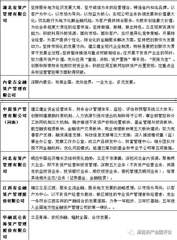 從整體上來看,地方AMC圍繞著不良資產(chǎn)處置這一基礎(chǔ)業(yè)務(wù)開展了多種相關(guān)業(yè)務(wù),通過設(shè)立基金、不良資產(chǎn)證券化、債轉(zhuǎn)股和并購重組等方式對不良資產(chǎn)處置鏈進行挖掘。而從業(yè)務(wù)拓展上升到戰(zhàn)略層面,各地方AMC也都在積極的整合當(dāng)?shù)刭Y源,與地方政府、銀行和其他金融機構(gòu)尋求合作,并根據(jù)地緣特征和相關(guān)的股東背景,發(fā)掘區(qū)域內(nèi)潛在的市場需求,開展“區(qū)域?qū)?rdquo;業(yè)務(wù),形成自身的業(yè)務(wù)特色。部分地方AMC的經(jīng)營戰(zhàn)略如表7所示。