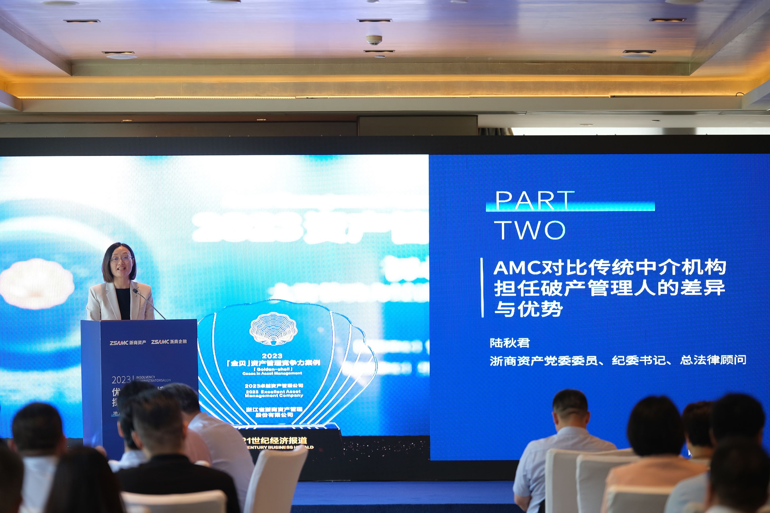 浙商資產(chǎn)黨委委員、紀委書記、總法律顧問陸秋君從專業(yè)經(jīng)驗、治理結構、人才配置、資源整合、資金融通等方面著重分析了AMC對比傳統(tǒng)中介機構在擔任破產(chǎn)管理人方面的比較優(yōu)勢,并指出AMC應準確把握當前經(jīng)濟社會發(fā)展新形勢,加強破產(chǎn)管理業(yè)務的雙向加速賦能,依照前瞻化、市場化、法治化原則,因地制宜,采取債權轉讓、托管、債務重組、資產(chǎn)重組、共益?zhèn)?、破產(chǎn)重整、市場化債轉股、財務顧問等多種方式化解風險,充分發(fā)揮地方AMC功能作用。