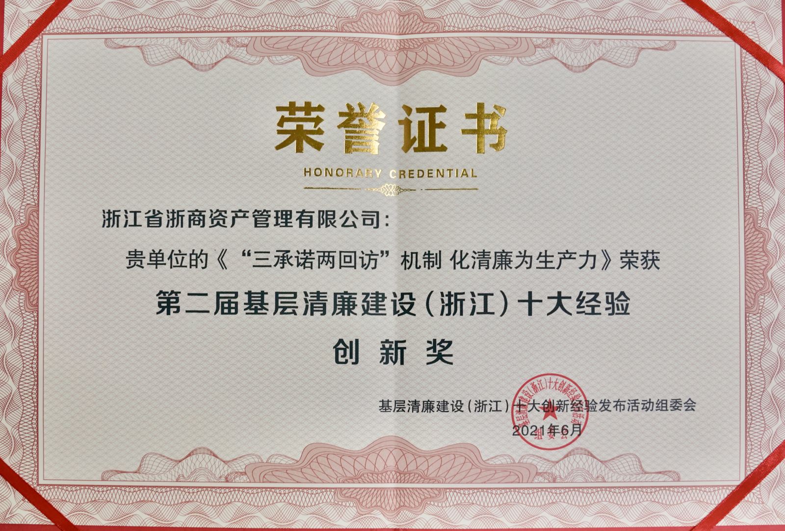 6月18日,由省紀委省監(jiān)委指導,浙江日報報業(yè)集團、浙江大學主辦,《反腐敗導刊》雜志社、浙江大學廉政研究中心承辦的第二屆“基層清廉建設(浙江)十大經驗”發(fā)布活動在杭州隆重舉行,浙商資產《“三承諾兩回訪”機制 化清廉為生產力》榮獲“創(chuàng)新獎”。